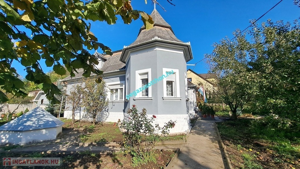az egyedi stílusú, nagypolgári hangulatú, egyszintes, alápincézett, manzárdtetős családi ház