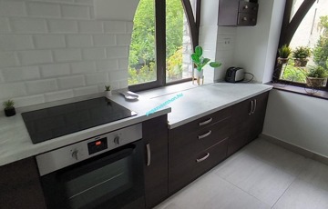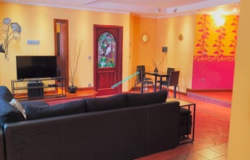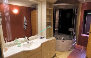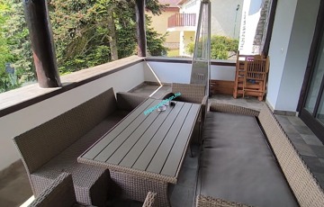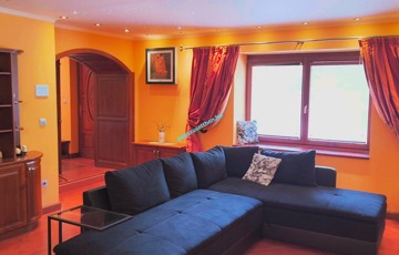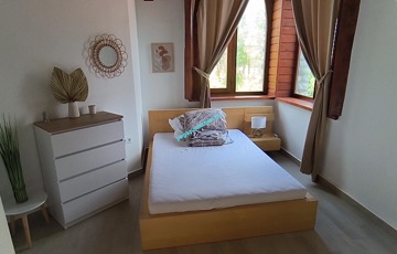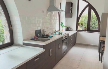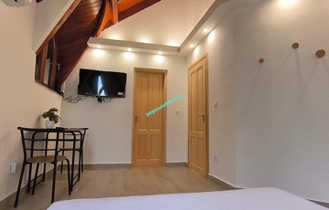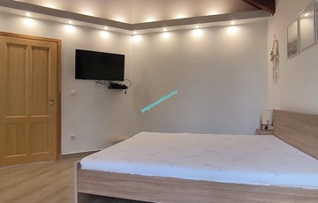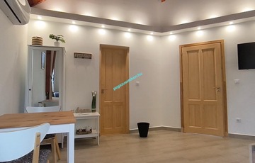-Földszinti egysége külön apartmant alkot, nagyméretű nappalival, hálószobával, a fürdőszobában szaunával, és konyhával.