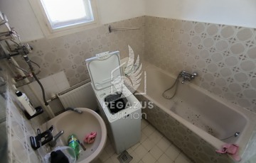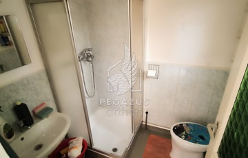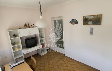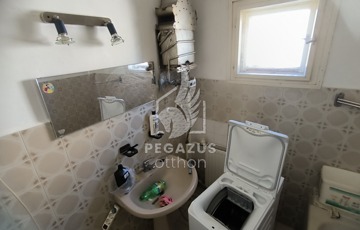 A bejáratból nyíló közlekedőn keresztül juthatunk el egy zuhanyzós fürdőszobába WC-vel, egy kis főzőfülkébe és egy tágas szobába. Ezen a szinten található a garázs és a fűtési helyiség is, melyben vegyestüzelésű és gázkazán is biztosítja a fűtést.